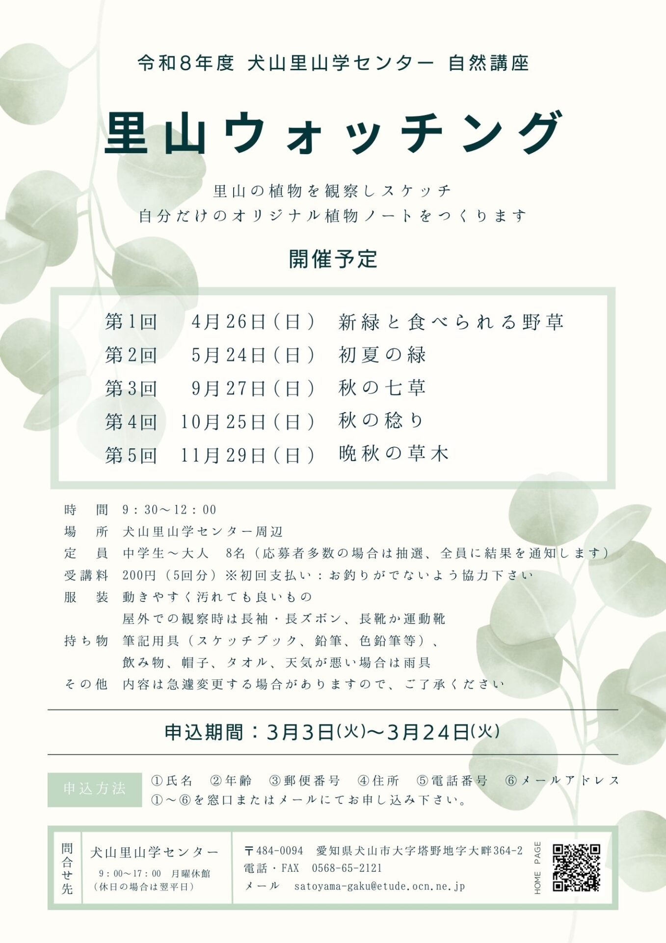 ⾥⼭学センター周辺を歩いて、草⽊や⿃などを観察し、 絵と⽂章にまとめ、⾃分の博物誌を作ってみませんか。